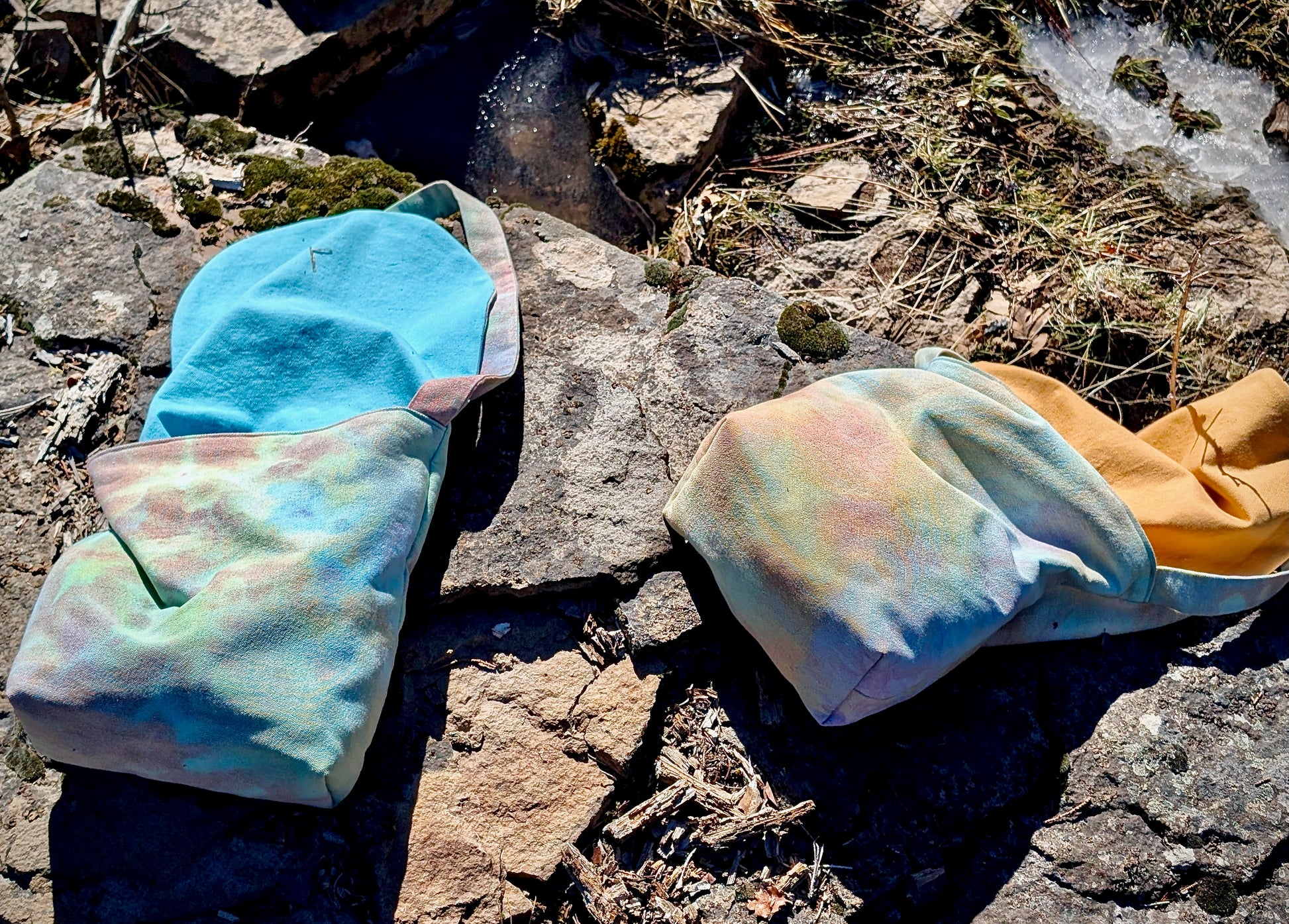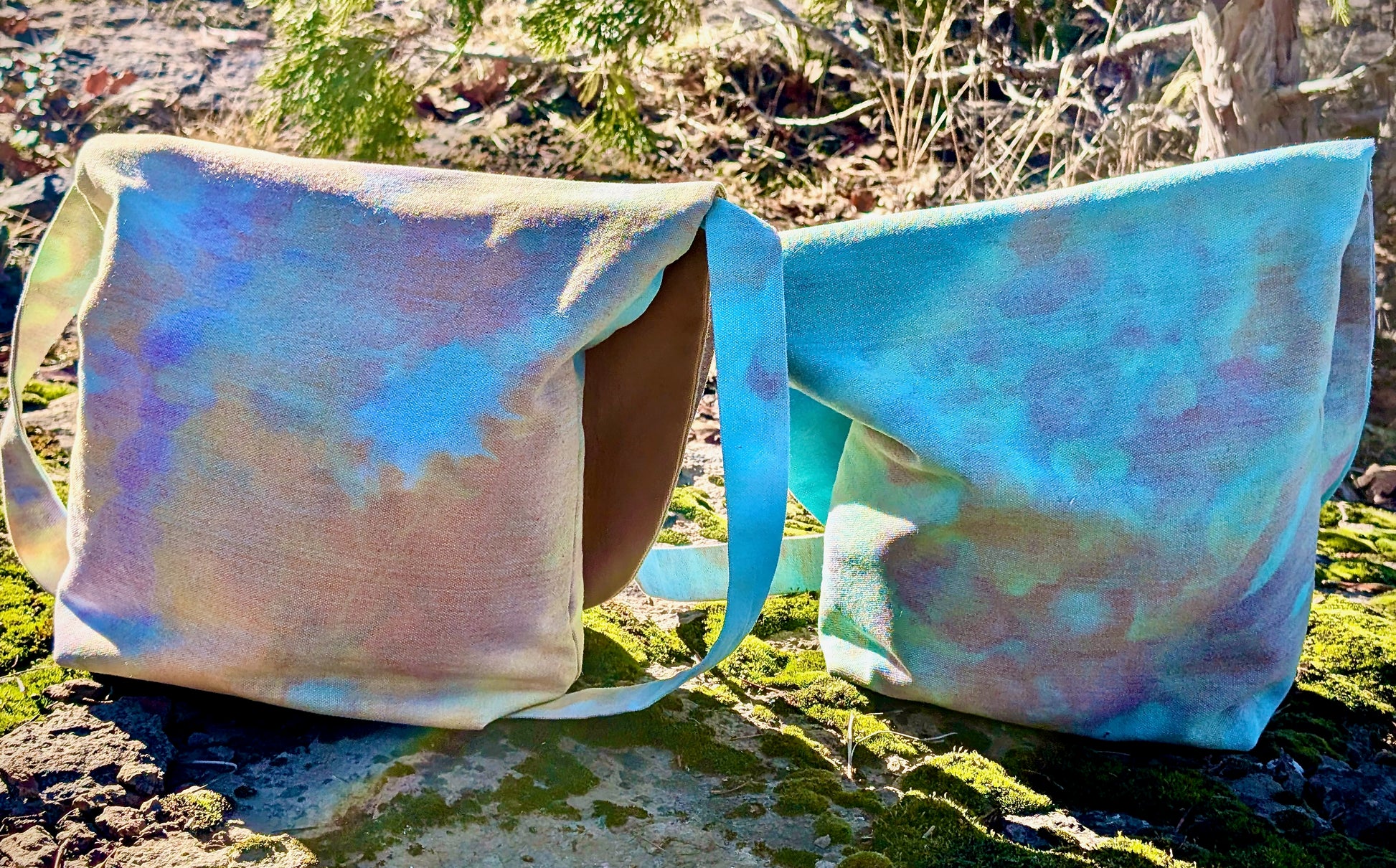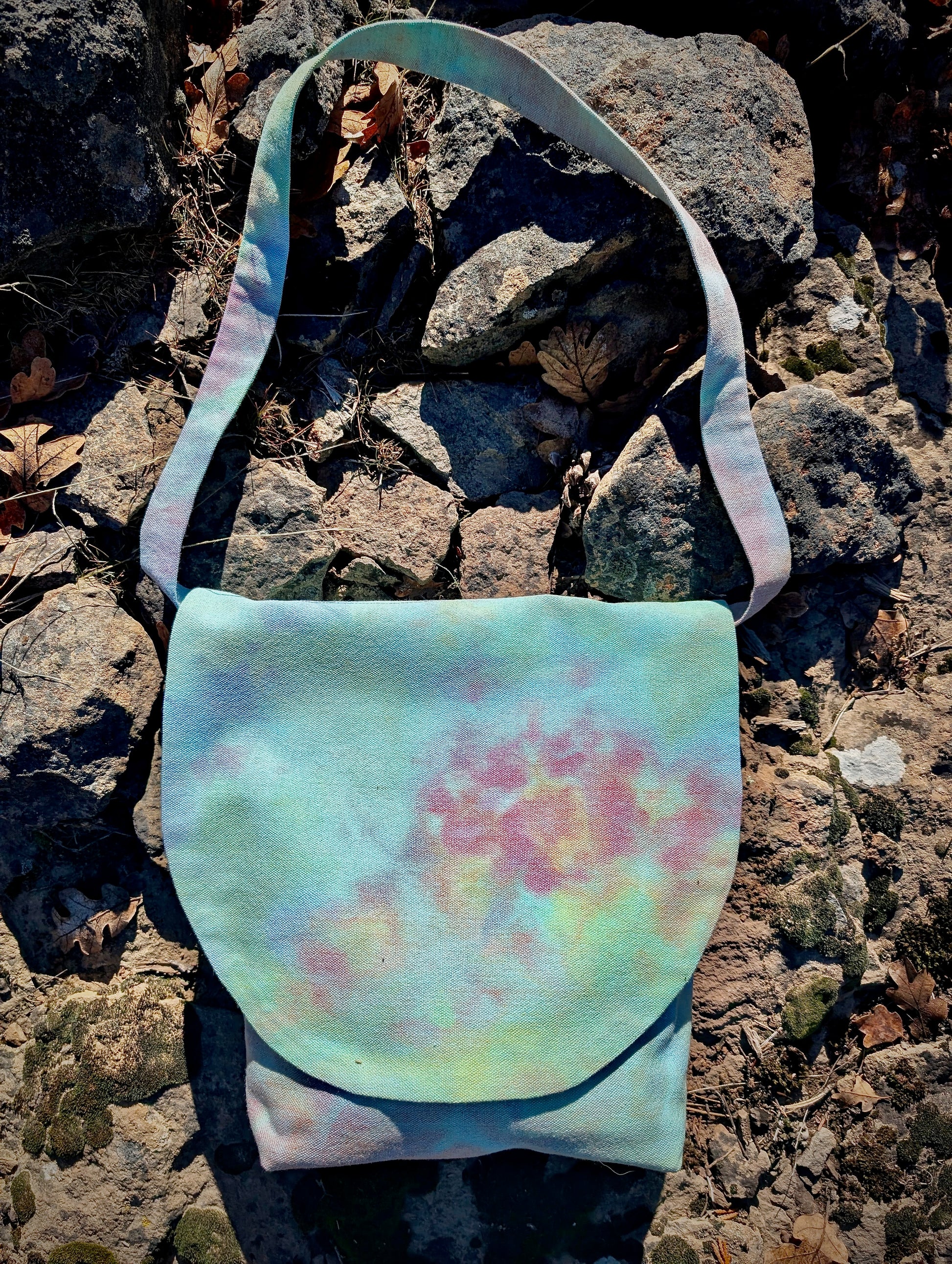 This easy and chic shoulder bag will be your go-to carry all! Just the right size for everyday use. Dyed with ice crystals from the mountain tops in California.