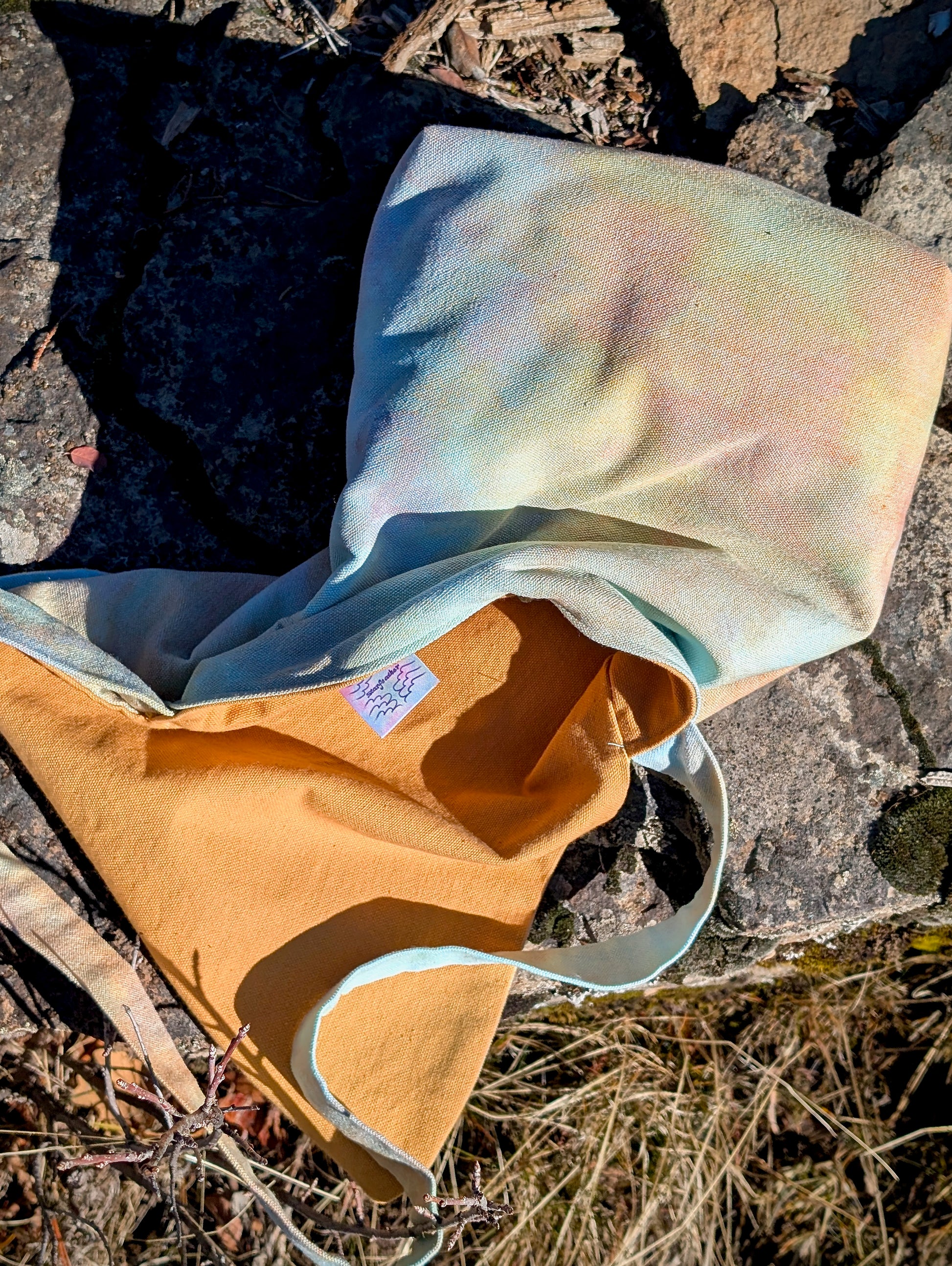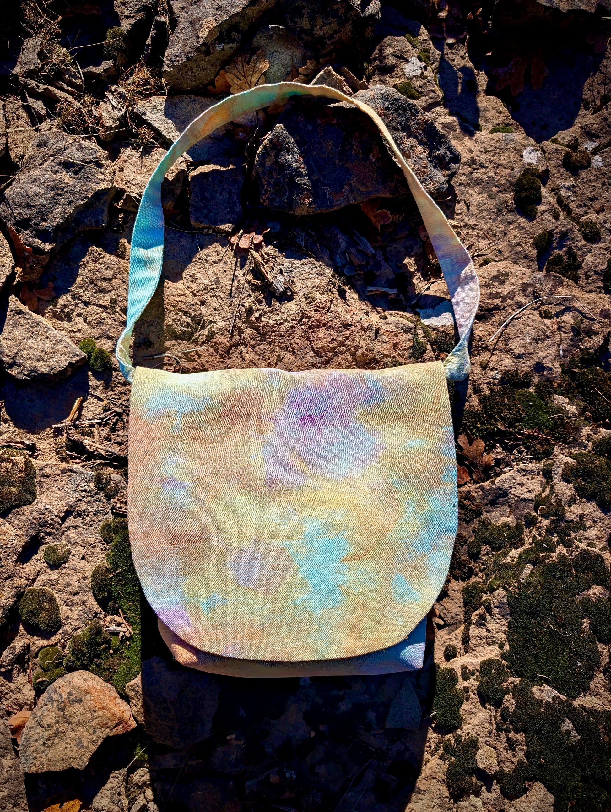 This easy and chic shoulder bag will be your go-to carry all! Just the right size for everyday use. Dyed with ice crystals from the mountain tops in California.